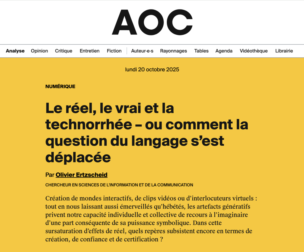 Mon dernier texte s’intitule « Le réel, le vrai et la technorrhée. Comment la question du langage s’est déplacée. » Il est disponible sur AOC depuis le 20 octobre 2025 (et sera donc republié ici fin décembre). C’est un texte assez long et assez dense qui propose plusieurs concepts (celui de technorrhée, celui « d’assemblages machiniques informationnels », et quelques autres encore), travaille plusieurs aspects de l’IA au travers des différents générateurs (de texte, d’image, de vidéo), qui revient aussi sur les cadres discursifs et langagiers qui se trouvent bousculées et remodelés et tente de replacer ces dernières évolutions dans le temps long des espaces discursifs en ligne, qui ont, depuis l’invention des plateformes de médias sociaux, toujours été davantage astreignants que libératoires. Parmi quelques-uns des aspects développés dans ce texte, je vous livre ici deux courts extraits qui, je l’espère, vous donneront envie de lire l’ensemble sur AOC (et de vous y abonner, c’est un espace de réflexion et de respiration aussi salutaire que nécessaire dans l’époque actuelle).