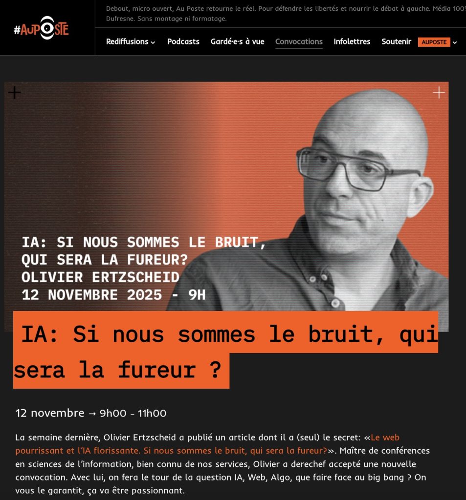 Je suis convoqué au poste, ce mercredi à 9h. Mais je vous rassure, Christelle Morançais n’y est pour rien. Et c’est avec plaisir que je me rends à la convocation de David Dufresne. On va causer autour de mon dernier article, des IA, du web et des plateformes, et des horizons de discours et de société que tout cela dessine … ou efface.