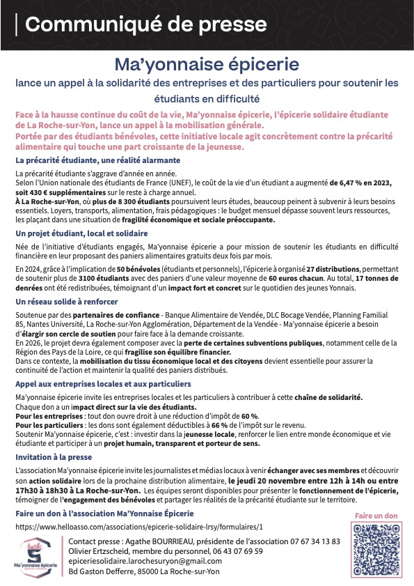 Ce petit être c’est une association, c’est une épicerie solidaire pour les étudiant.e.s, c’est la Ma’Yonnaise épicerie. Bah les ami.e.s, figurez-vous que la Ma’Yonnaise est dans la sauce. Bien sûr on va rien lâcher. Mais comme tant d’autres associations, des géants comme les Restos du Coeur ou la Banque Alimentaire jusqu’aux associations presqu’invisibles qui chaque jour oeuvrent en silence (nous par exemple on bosse, entre autres, avec DLC Bocage Vendéen qui nous apporte fruits et légumes à donner à nos bénéficiaires), et en passant par l’indispensable mais pourtant toujours menacé Planning Familial, comme tant d’autres associations, « rien lâcher » ça veut dire faire appel à vous toutes et tous.