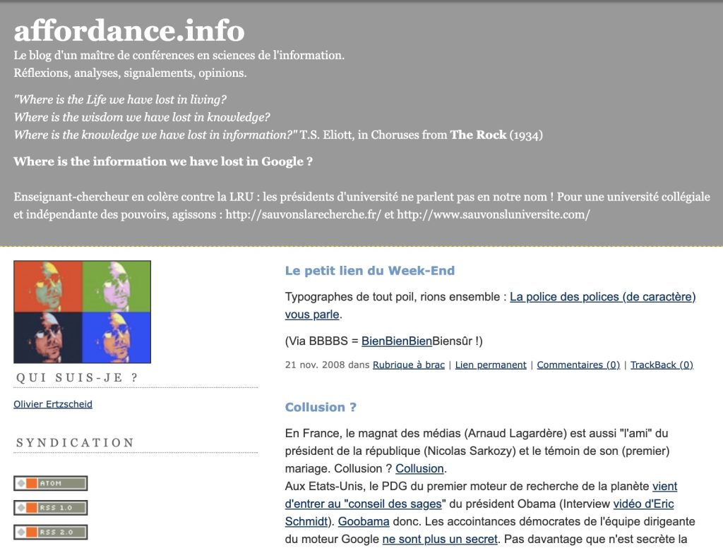 Vingt ans et trois mille articles. Et au moins 4 époques du numérique traversées. Première époque. Celle où tenir un blog en étant universitaire vous ramenait mépris et quolibets. Celle où des mandarins (et pas mal de mandarines aussi) vous expliquaient que prendre ainsi la parole en ligne c’était … un suicide scientifique et d’une absence totale d’intérêt (si si je l’ai entendu j’vous jure). Deuxième époque. Celle des egotrips et classements Technorati ou Wikio des meilleurs blogueurs influents (où je figurais souvent dans un improbable top 50), de Loïc Le Meur en figure totémique de la caricature de l’entrepreneur numérique, et des invitations (que je refusais) dans divers cénacles ministériels et élyséens. C’était une époque épique (et nous n’avions déjà plus rien d’épique). Troisième époque. Celle de la normalisation, des communautés, des liens, des fils RSS et des agrégateurs, des « trackbacks », d’un écosystème vivant d’échanges du tout début et des premiers temps des réseaux sociaux avant qu’ils ne deviennent entièrement des « médias sociaux » et que tout cela ne se reconfigure entièrement. Quatrième époque. Celle aujourd’hui où si peu « tiennent » encore des blogs mais où tant d’autres vont vivre la connaissance en ligne et rendent possible son partage, sur Youtube, Instagram, Twitch, en podcast et partout finalement, dans des formes renouvelées, fécondes, stimulantes mais en lutte et en résistance contre l’écrasement de l’invisibilité et de la difficulté à donner à cela toute sa place.